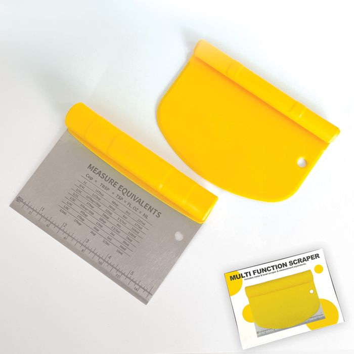 Includes metal & bowl scraper & measurement equivalents. With stainless steel and plastic scrapers, cut dough cleanly on any surface, even on non-stick pastry mats.
